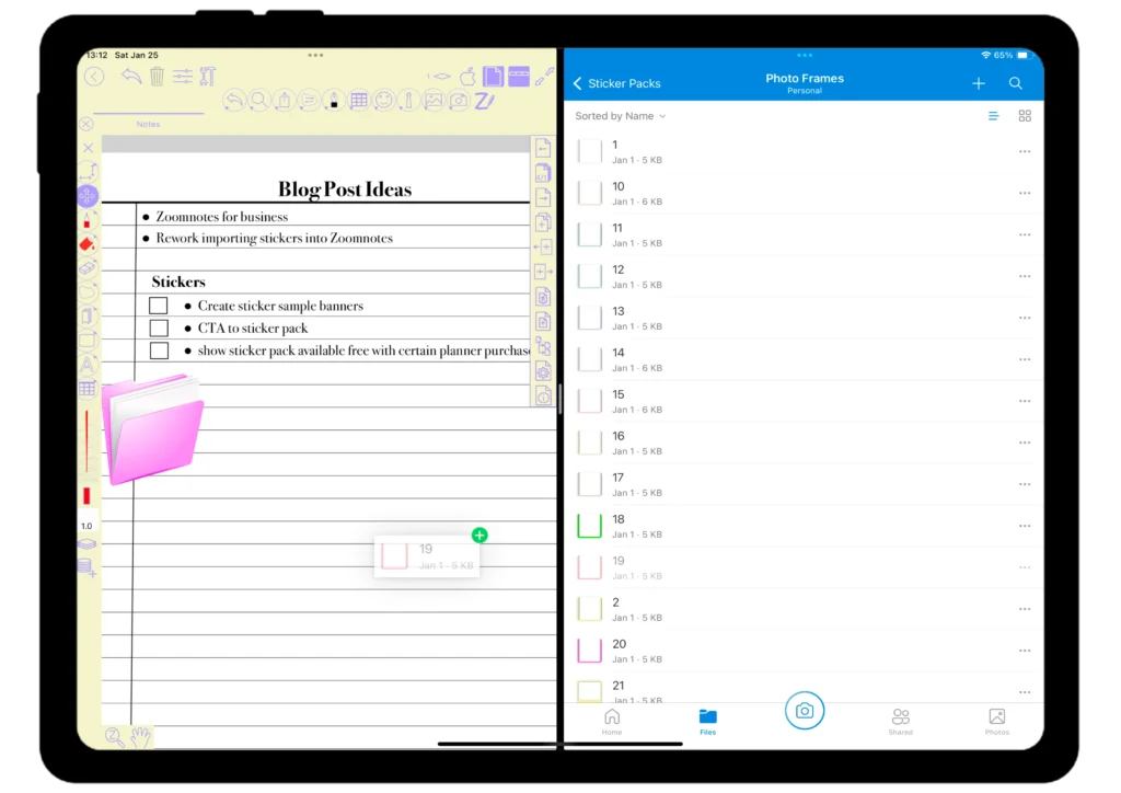 - You can also split screen from a cloud service and drag and drop the sticker onto the page. I prefer this method as it saves space on my iPad.